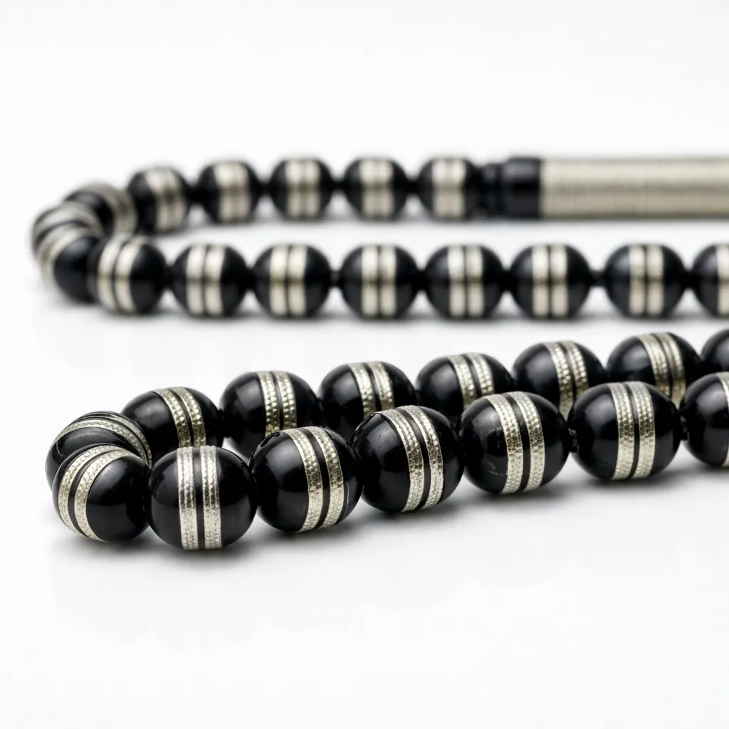 المناسبات: بفضل لونه الأسود المطعم بالفضة، يعد هذا المسباح خياراً مثالياً للمناسبات الرسمية التي تتطلب أناقة كلاسيكية، كما يعتبر هدية فاخرة تدوم طويلاً بفضل جودة المواد الطبيعية المستخدمة.