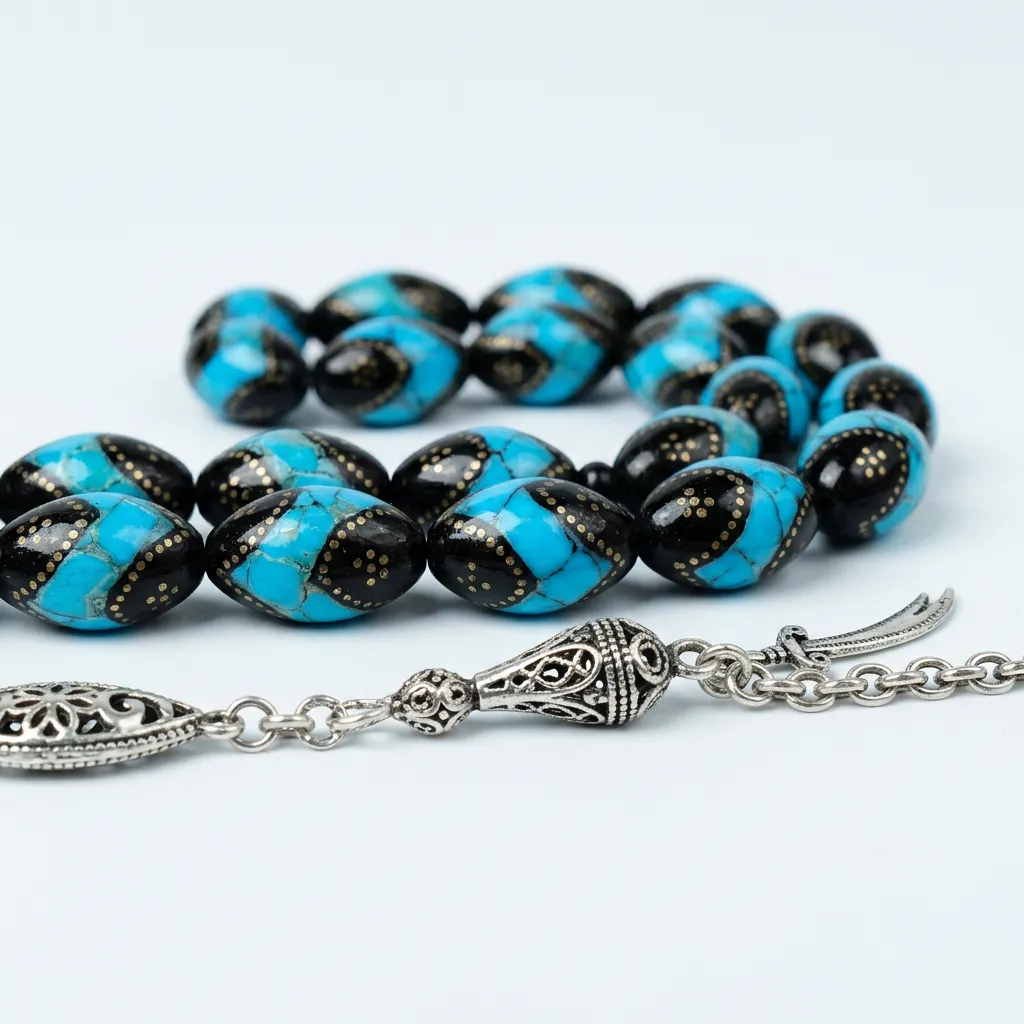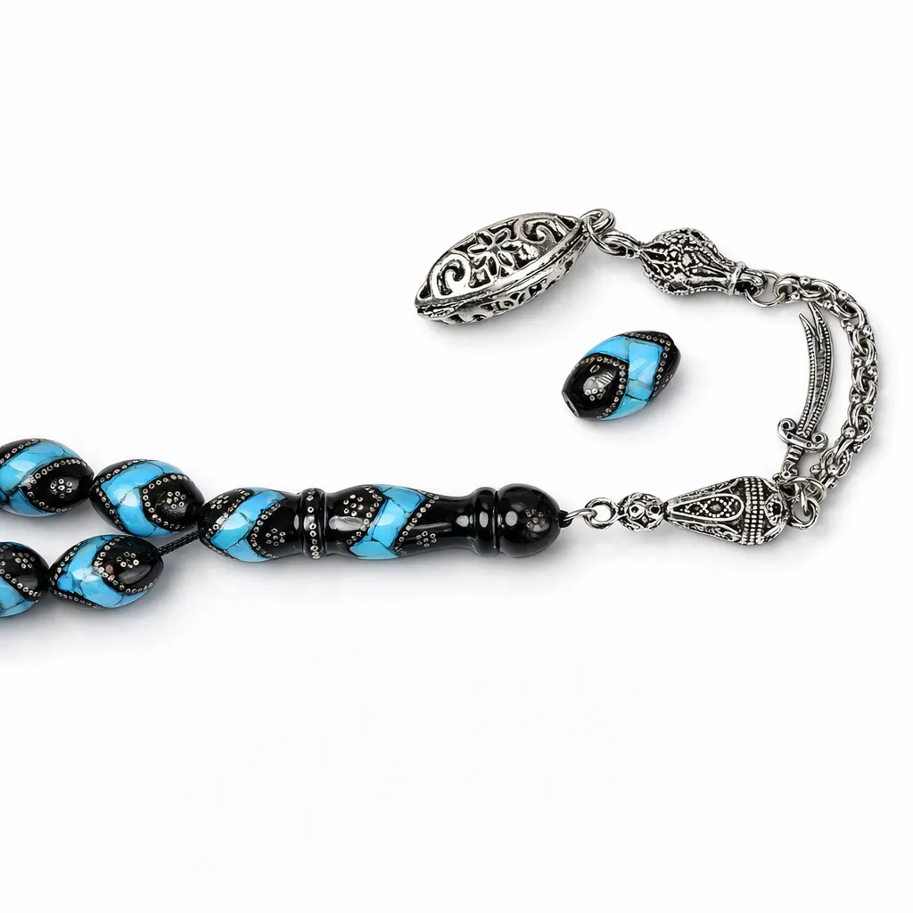 تجربة الاستخدام: تتميز خامة اليسر بملمس طبيعي دافئ يزداد لمعاناً مع كثرة اللمس، ومع تطعيم الفضة والفيروز، ستشعر بوزن الخرزات وتوازنها المثالي في اليد. الخرز مقصوص بشكل بيضاوي منسجم يوفر انسيابية فائقة أثناء التسبيح.
